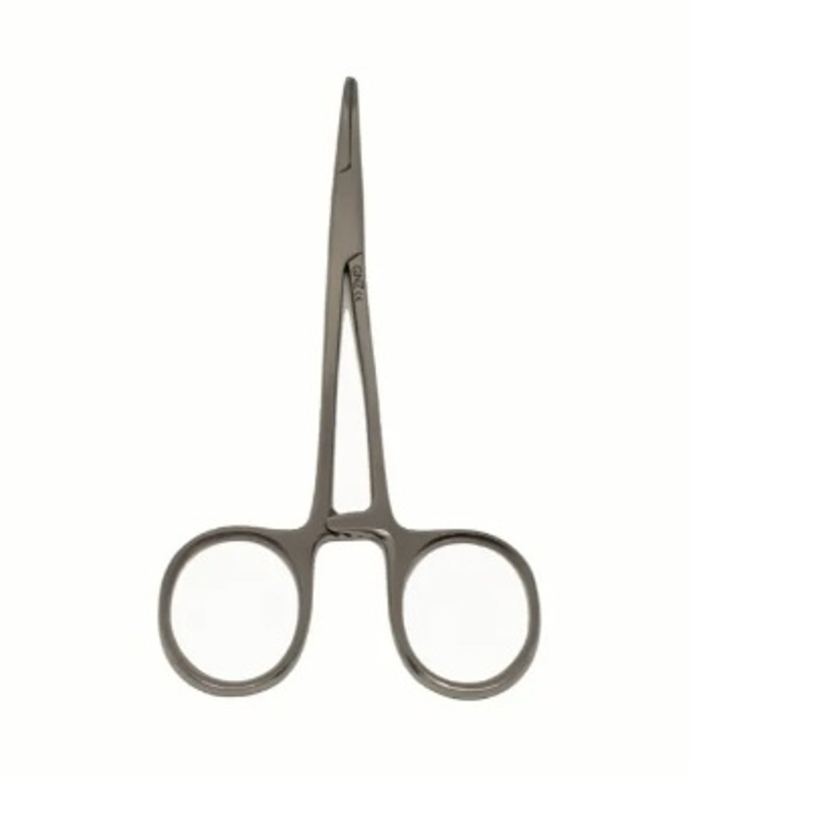 Pinça mosquito com parte ativa curva, sem dentes, fabricada de aço inoxidável.