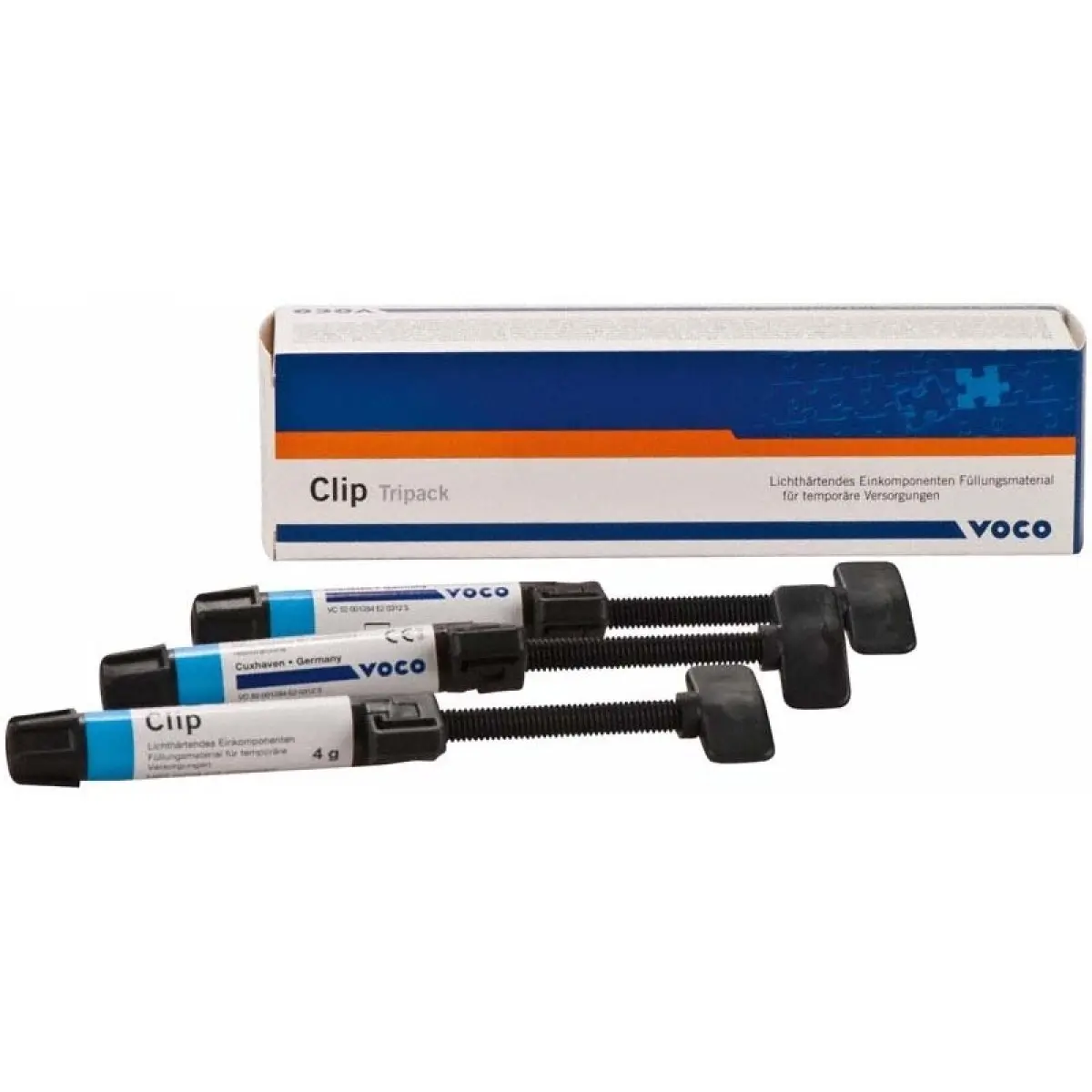 O Clip da VOCO é um material restaurador fotopolimerizável para restaurações provisórias. A utilização de Clip é exclusivamente indicada para uso dentário em obturações temporárias e selagem temporária de cáries (especialmente na técnica inlay/onlay).
