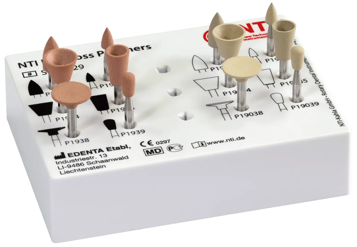 O SET-1729 da NTI é um conjunto de polidores diamantados da linha DiaGloss, destinado a polimento de compósitos restauradores. Composto por 12 unidades de polidores — combinando peças para pré-polimento e polimento final