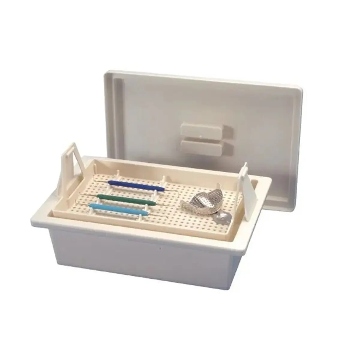 Tina para desinfeção por imersão, fabricada em plástico rígido e esterilizável em autoclave.